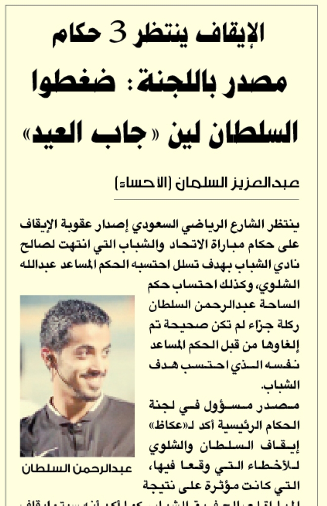 خلت تكليفات لجنة الحكام لمباريات الدور ربع النهائي في مسابقة كأس ولي العهد، التي ستنطلق اليوم وغدا، من اسمي حكم الساحة عبدالرحمن السلطان، والحكم المساعد عبدالله الشلوي بعد الأخطاء التي حدثت منهما في مباراة الكلاسيكو التي جمعت الاتحاد والشباب (الخميس) الماضي ضمن مباريات الجولة السادسة من دوري جميل للمحترفين، إذ سيقود مباراة الهلال والشباب اليوم على إستاد الملك فهد الدولي بالرياض الحكم الدولي فهد المرداسي، ويساعده الدوليان محمد العبكري، وأحمد فقيهي، وحكم رابع سامي الجريس، فيما سيتولى إدارة مباراة الاتحاد والباطن اليوم على ملعب حفر الباطن الحكم الدولي شكري الحنفوش، ويساعده ماجد الناصر، والدولي ناصر المظفر، وحكم رابع نايف المريخي، فيما سيقود مباراة النصر والوحدة غدا على إستاد الملك فهد الدولي الحكم خالد الطريس، ويساعده عبدالله الأحمري، ويحيى معتق، وحكم رابع عبدالله العويدان، فيما سيتولى إدارة مباراة الأهلي وهجر غدا على ملعب مدينة الأمير عبدالله بن جلوي الرياضية بالأحساء الحكم محمد النحيت ويساعده هشام الرفاعي وماجد سرور وحكم رابع محمد الهويش.
