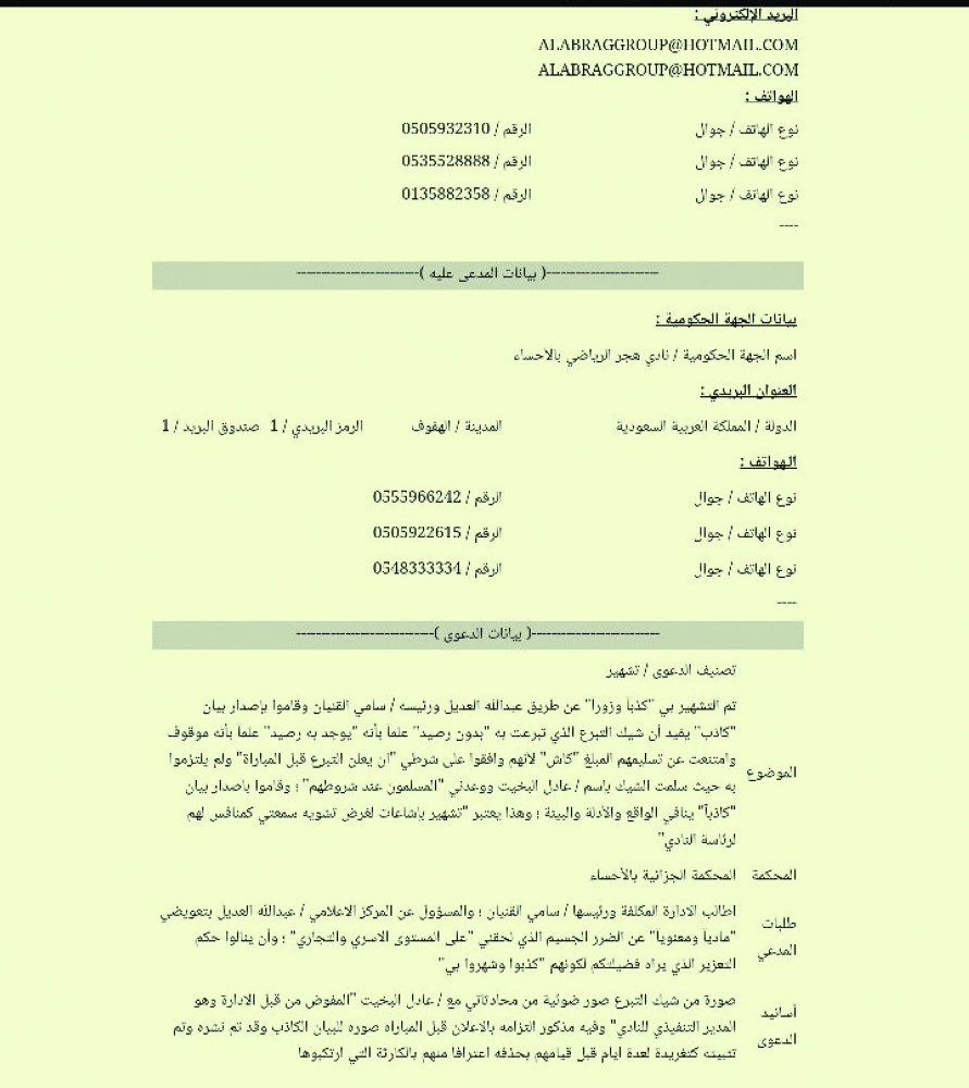 «عكاظ» بدورها تواصلت مع أحد المدعى عليهم وهو مدير المركز الإعلامي بنادي هجر عبدالله العديل في الإدارة الموقتة برئاسة سامي القنيان إذ قال «نحن في بلد الأمن والأمان وبلد الحق وطالما أن القضية منظورة في المحكمة سأتركها للشرع ولا أستطيع التعليق أكثر من ذلك ولكن سنرى من يضحك في الآخر.