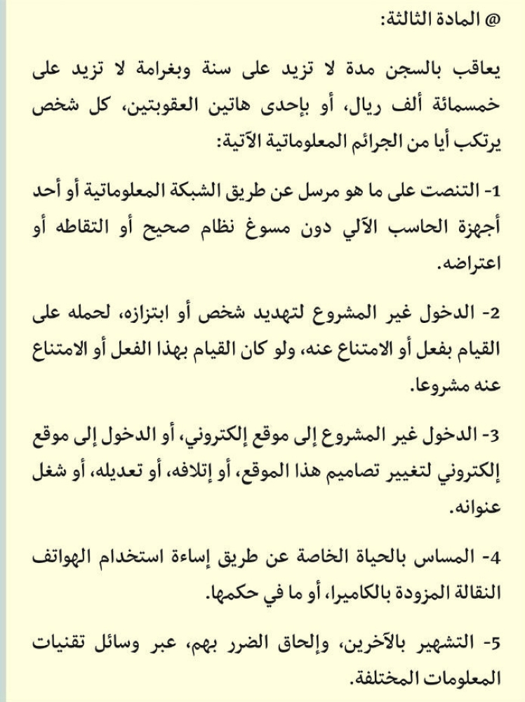 يذكر أن «نظام مكافحة الجرائم المعلوماتية» المعتمد من مجلس الوزراء وفي مادته الثالثة ينص على أن يعاقب المدان بهذه التهم بعد ثبوتها عليه بالسجن مدة لا تزيد على سنة وبغرامة لا تزيد على 500 ألف ريال أو بإحدى هاتين العقوبتين كل شخص يرتكب الجريمة المعلوماتية، مثل التشهير بالآخرين؛ وإلحاق الضرر بهم؛ عبر وسائل تقنيات المعلومات المختلفة.