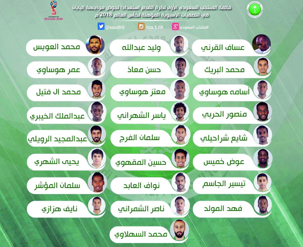 جاءت خيارات المدير الفني الهولندي بيرت فان مارفيك لقائمة المنتخب السعودي الأول لكرة القدم للمشاركة في معسكر الأخضر في العاصمة اليابانية «طوكيو» استعدادا لخوض مواجهة الجولة الخامسة أمام منتخب اليابان في الخامس عشر من شهر نوفمبر ضمن منافسات التصفيات الآسيوية المؤهلة لكأس العالم لكرة القدم 2018.
