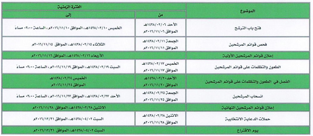 أعلنت لجنة الانتخابات برئاسة المستشار القانوني خالد بانصر عن البرنامج الزمني لانتخابات مجلس إدارة الاتحاد السعودي لكرة القدم في دورته الجديدة وفتح باب الراغبين بالترشح اعتبارا من يوم الأحد القادم، ولمدة خمسة أيام على أن يتم فحص القوائم المرشحين يوم الجمعة (11 نوفمبر) إلى يوم الثلاثاء (15 نوفمبر)، بعدها تعلن قوائم المرشحين الأولية في يوم الأربعاء (16 نوفمبر)، ليتم استقبال الطعون على قوائم المرشحين يوم الخميس (17 نوفمبر) حتى الساعة الثانية عشر من منتصف ليلة السبت 19 من الشهر ذاته، ليتم الفصل في الطعون والتظلمات على قوائم المرشحين خلال خمسة أيام من يوم الأحد (20 نوفمبر) حتى يوم الخميس (24 نوفمبر). وبينت اللجنة أن الراغبين في الانسحاب من قبل المرشحين أمامه ثلاثة أيام ابتداء من الجمعة (25 نوفمبر) حتى يوم الأحد (27 نوفمبر)، ليتم بعدها إعلان القوائم الرسمية يوم الإثنين (28 نوفمبر)، على أن تنطلق الحملة الانتخابية للمرشحين في ذات اليوم حتى يوم الانتخابات السبت (31 ديسمبر) وهو موعد الاقتراع وتصويت أعضاء الجمعية العمومية لمجلس إدارة الاتحاد السعودي لكرة القدم الجديد.