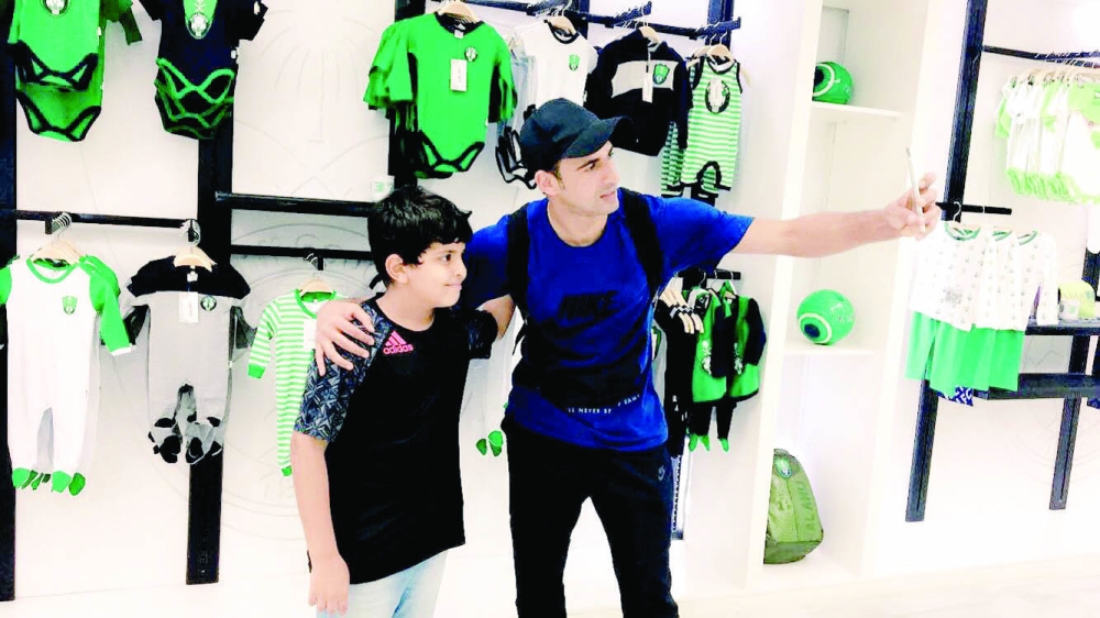 عماد الحوسني يلتقط سيلفي مع طفل أهلاوي في متجر النادي. (عكاظ)