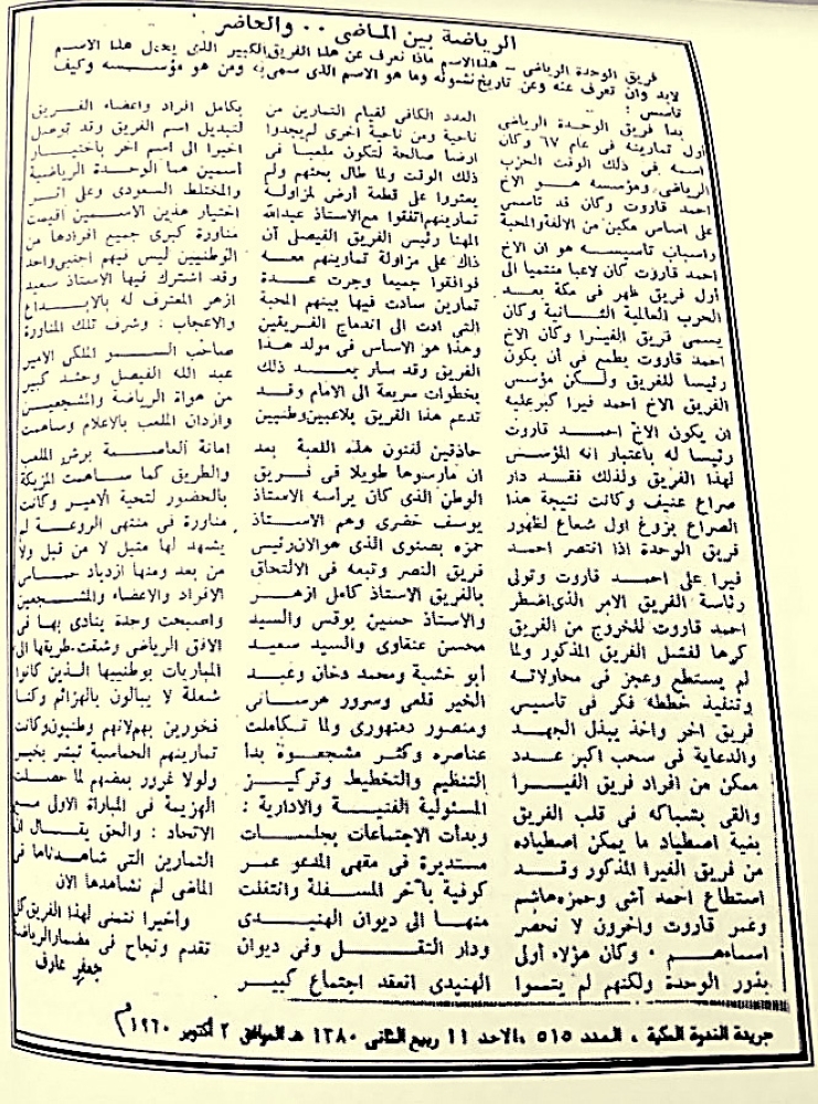 استعرض عبد المقصود خوجة والذي كان يشغل منصب رئيس تحرير جريدة أم القرى آنذاك وهو أحد أبناء مكة المكرمة، في إحدى مقالاته والذي نشر بتاريخ 12 صفر من عام 1351هـ أسماء الأندية وذكر الاتحاد أولا ولم يذكر فريق الوحدة إطلاقا، بل وأكد أن لعب الكرة لم يكن هواية يمارسها الشباب في مكة المكرمة وأبدى مخاوفه من انتشار اللعبة في مكة المكرمة في ظل تسارع انتشارها في جدة.
