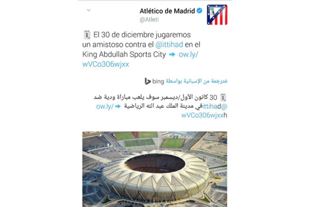 أعلن نادي أتلتيكو مدريد الإسباني عبر حسابه الرسمي عن توجهه للسعودية لخوض مواجهة ودية مع فريق الاتحاد السعودي على استاد الجوهرة بجدة يوم 30 ديسمبر القادم، وسيصل النادي الإسباني بكامل نجومه، يوم 29 من الشهر ذاته، وبذلك ستكون الجماهير الرياضية عامة، والاتحادية خاصة على موعد مع مباراة كبرى تجمع فريقي الاتحاد السعودي وأتلتيكو مدريد الإسباني قبل نهاية العام الميلادي 2016، على هامش احتفالية العميد بمرور 90 عاما على تأسيسه.