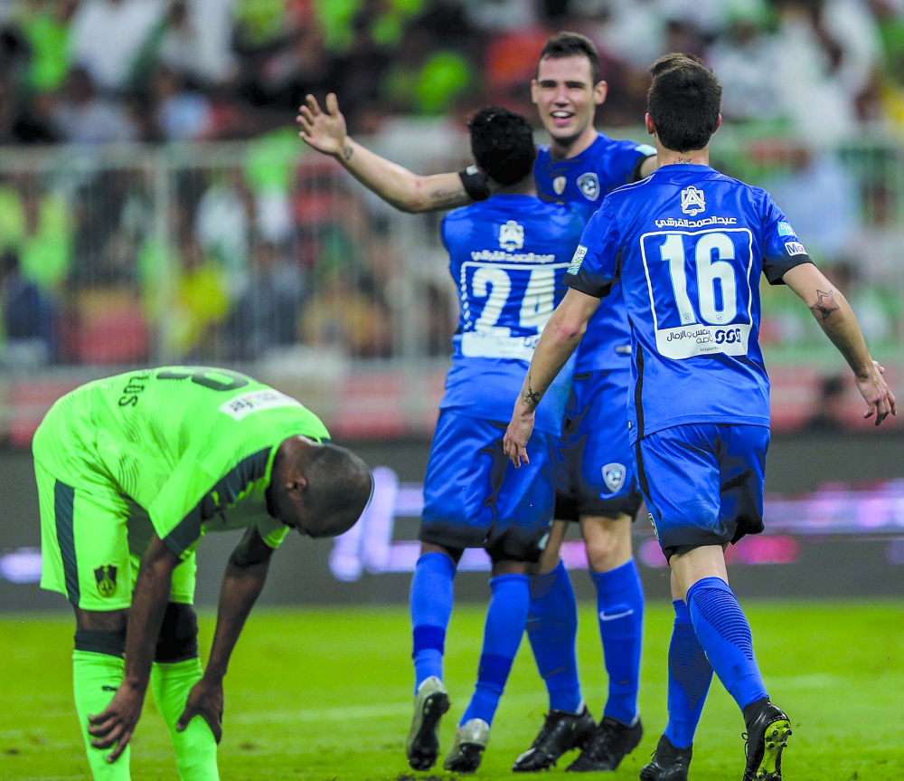 مهاجم الهلال ليو يحتفل بهدفه الأول في مرمى الأهلي أمس. (تصوير: عبدالغني بشير)