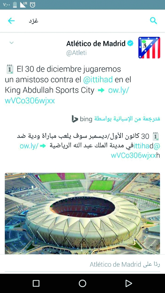 أعلن نادي أتلتيكو مدريد الإسباني عبر حسابه الرسمي عن توجهه للسعودية لخوض مواجهة ودية مع فريق الاتحاد السعودي على استاد الجوهرة بجدة يوم 30 ديسمبر القادم، وسيصل النادي الإسباني بكامل نجومه، يوم 29 من الشهر ذاته، وبذلك ستكون الجماهير الرياضية عامة، والاتحادية خاصة على موعد مع مباراة كبرى تجمع فريقي الاتحاد السعودي وأتلتيكو مدريد الإسباني قبل نهاية العام الميلادي 2016، على هامش احتفالية العميد بمرور 90 عاما على تأسيسه.