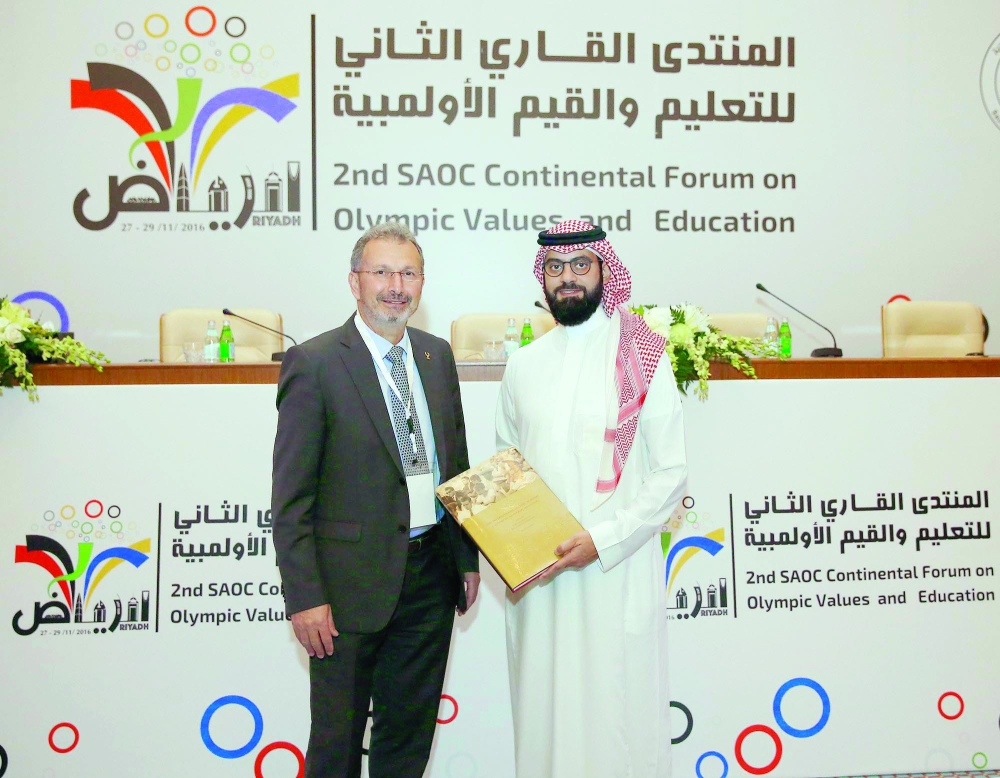 الأمير خالد بن بندر تسلم هدية من الأكاديمية الأوليمبية الدولية. (عكاظ)