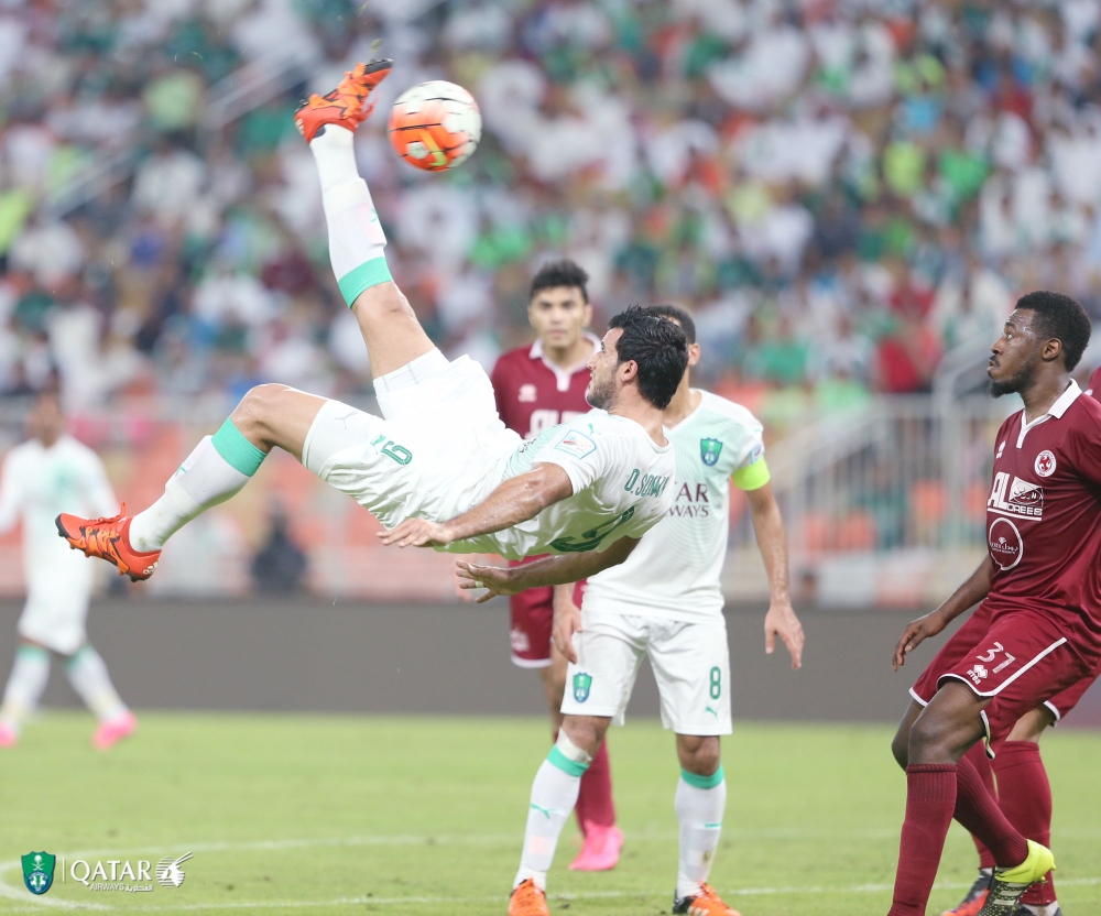 مهاجم الأهلي عمر السومة في حركة هوائية في مباراة سابقة أمام الفيصلي. (عكاظ)