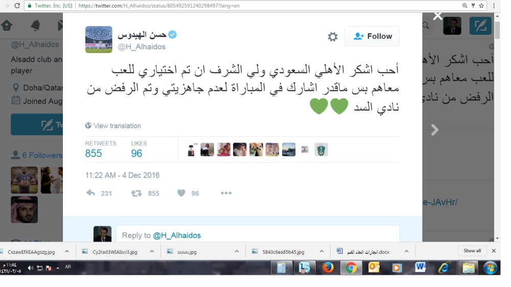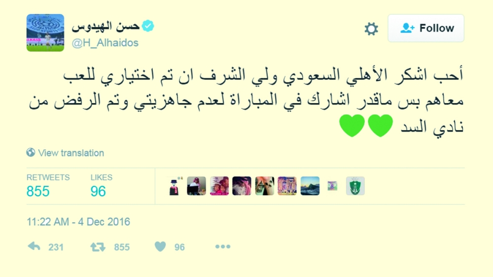 رفضت إدارة نادي السد القطري مشاركة لاعب خط وسط الفريق الكروي الأول حسن الهيدوس مع الفريق الأهلاوي في اللقاء الذي سيجمع الأهلي السعودي ببرشلونة الإسباني في الـ13 من ديسمبر الحالي، وذلك بسبب عدم جاهزية اللاعب، على حد قولهم. وكان الهيدوس هو الآخر تقدم باعتذار رسمي عبر صفحته الخاصة في وسيلة التواصل الاجتماعي «تويتر» مؤكداً أنه كان يمنّي النفس بمشاركة أشقائه في النادي السعودي، مفتخراً بذلك، إلا أن عدم جاهزيته، ورفض إدارة ناديه حالا دون ذلك، متمنياً التوفيق للأهلي السعودي في المواجهة الودية المرتقبة.