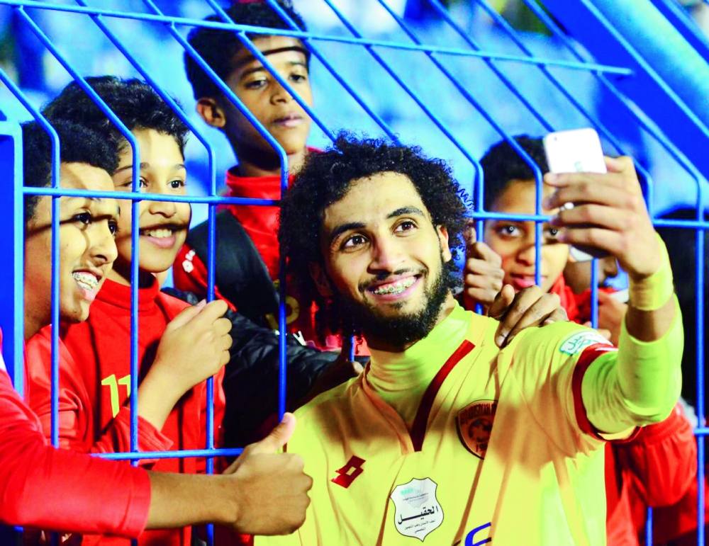 العبيد يلتقط «سيلفي» مع مشجعي القادسية. (عكاظ)
