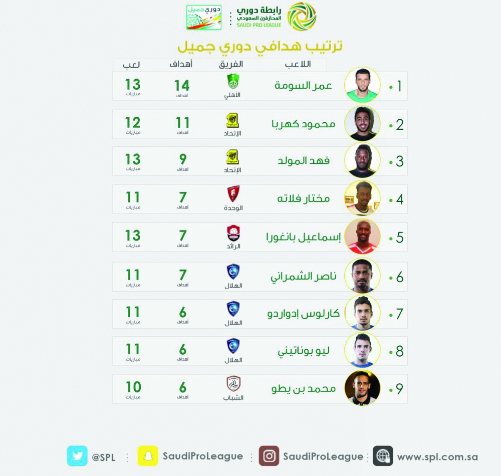 مع ختام الدور الأول من دوري جميل السعودي للمحترفين، وخوض فرقه 13 مواجهة حددت بشكل أو بآخر المتنافسين الأوفر حظا للظفر باللقب، وحتى المتصارعين في سلّة المؤخرة، إذ يتربع الكبار الأربعة (الاتحاد، الهلال، الأهلي والنصر) على عرش المراكز الأولى، فيما يهدد السقوط ستة فرق يتذيلها الفتح الذي كان قبل سنوات حاملا مستحقا للقب الدوري.