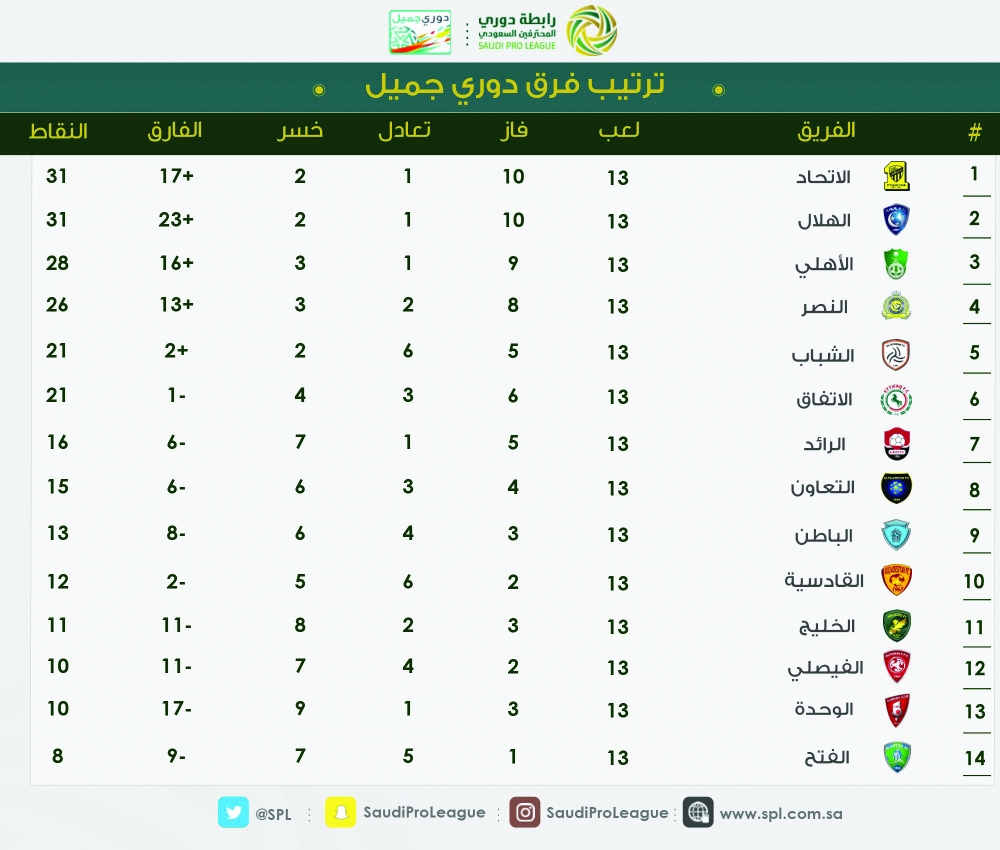 مع ختام الدور الأول من دوري جميل السعودي للمحترفين، وخوض فرقه 13 مواجهة حددت بشكل أو بآخر المتنافسين الأوفر حظا للظفر باللقب، وحتى المتصارعين في سلّة المؤخرة، إذ يتربع الكبار الأربعة (الاتحاد، الهلال، الأهلي والنصر) على عرش المراكز الأولى، فيما يهدد السقوط ستة فرق يتذيلها الفتح الذي كان قبل سنوات حاملا مستحقا للقب الدوري.