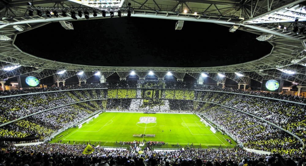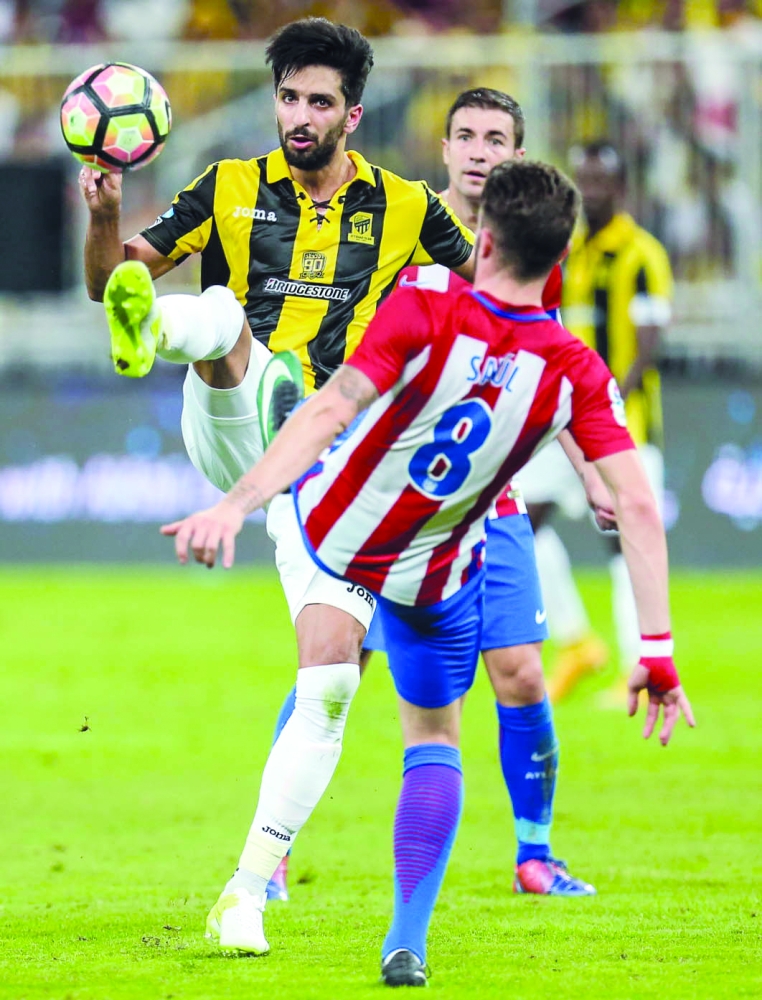 في احتفالية تاريخية لنادي الاتحاد بمناسبة مرور 90 عاما على تأسيسه، التي شرفها محافظ محافظة جدة الأمير مشعل بن ماجد، وبحضور رئيس الهيئة العامة للرياضة الأمير عبدالله بن مساعد، ووسط حضور جماهيري كبير، خسر فريق الاتحاد لقاءه الودي الذي جمعه بأتلتيكو مدريد الإسباني على ملعب مدينة الملك عبدالله الرياضية بجدة، بثلاثة أهداف مقابل هدفين، إذ أنهى الاتحاد الشوط الأول متقدما بهدفين لهدف، ولكن خبرة الفريق الإسباني رجحت به في الشوط الثاني.وقد استهل الفريقان المباراة بأداء سريع من الطرفين، وكانت الأفضلية للاعبي الاتحاد بفضل مايسترو الوسط فهد الأنصاري وزملائه، وبرغم تمكن أتلتيكو من التسجيل أولا عن طريق خوان فران في الدقيقة 23، إلا أن لاعبي الاتحاد استطاعوا أن يفرضوا حضورهم الميداني، ما صنع فرصا حقيقية لثلاثي الهجوم المولد والعكايشي وكهربا، وتمكن محمود كهربا من ترجمة تفوق الاتحاد بهدف أول عادل به النتيجة عند الدقيقة 44 إثر استغلاله للكرة العرضية من أحمد العكايشي، ليعود محمود كهربا بعد دقيقتين للتلاعب بالدفاعات الإسبانية ويرد هدية العكايشي بكرة عرضية تمكن الأخير من تسجيلها هدفا ثانيا للاتحاد في الدقيقة 46، لينتهي الشوط الأول بتقدم الاتحاد بهدفين لهدف.