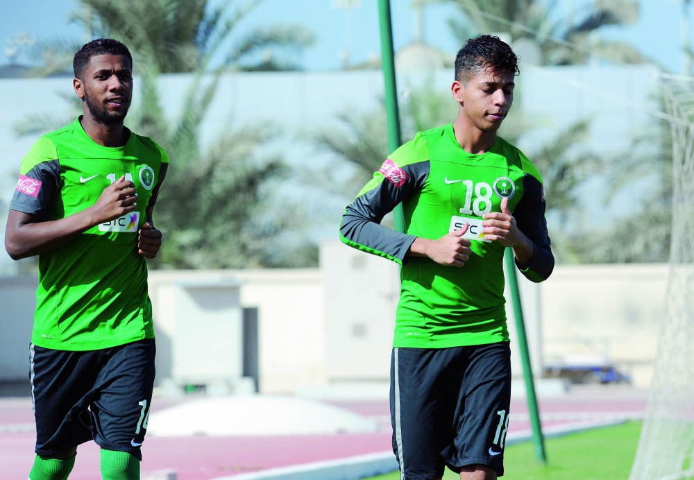 الثنائي الشاب عبدالرحمن الدوسري وسامي النجعي في تدريبات المنتخب السعودي أخيراً في أبوظبي.
