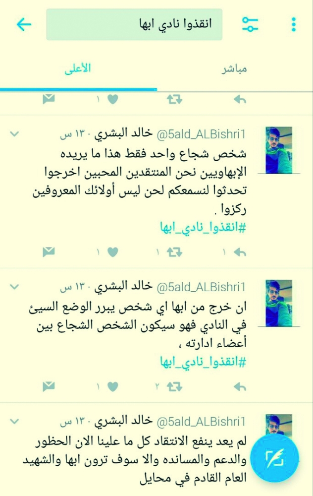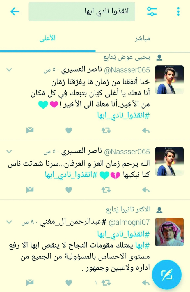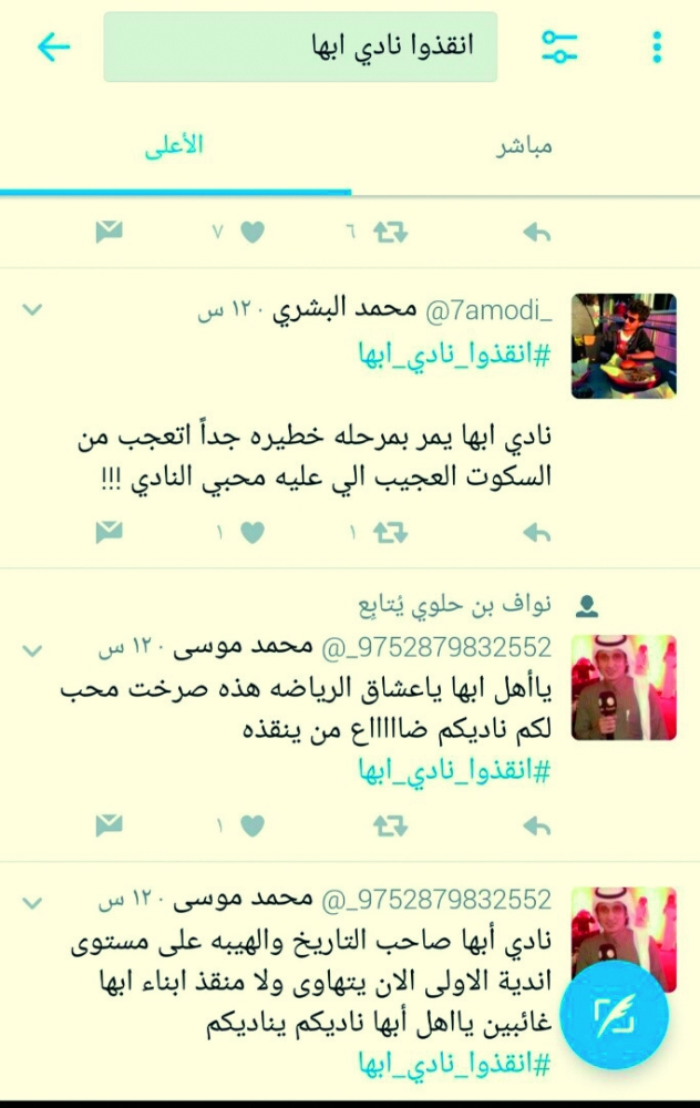 استحدث محبو نادي أبها عبر مواقع التواصل الاجتماعي هاشتاقا، عنونوه بمسمى «أنقذوا نادي أبها» وذلك نظرا إلى الحال المرير الذي وصل إليه النادي من تفريغ ونتائج لا تليق بهذا النادي في الأعوام الأخيرة، وتفاعل مع ذلك الهاشتاق الكثير من المحبين والغيورين على النادي، وطالب البعض بعقد اجتماع طارئ لكل المحبين والتلاحم لإنقاذ النادي من الهبوط لدوري المناطق كونه حاليا ينافس على الهبوط بعد سلسلة الهزائم المتتالية، فيما طالب البعض بنبذ الخلافات الآن وعدم فتح أي صفحات قديمة والتفرغ لمهمة انتشال الفريق في الوقت الحالي كون الهبوط لدوري المناطق أمرا لا يصدقه المحبون حسب وصفهم، في حين طالب بعض المحبين أعضاء مجلس الإدارة الحالية بالشجاعة والخروج للحديث عن أوضاع النادي بعد الانهيار الذي يتعرض له أخيرا وكشف المتسبب بوصول النادي إلى هذا الحال ومحاسبته، فيما هاجم البعض الإدارة الحالية واعتبرها سببا رئيسيا في تردي النتائج كونها فرغت النادي من أبنائه القدامى واستعانت بخطوة غير محمودة بأفراد لهم انتماءات بأندية أخرى في المنطقة منافسة، وشدد البعض على أن الإدارة السابقة هي بداية الإخفاق معتبرين الحالة الحالية امتدادا لما سبقتها في التخبط والفوضى، يأتي ذلك التفاعل والمناداة نظرا إلى احتلال نادي أبها لمراكز متأخرة في سلم ترتيب أندية الدرجة الثانية بعد سلسلة الهزائم التي لحقت بالفريق أخيرا من أندية تحتل المركز الأخير في الترتيب وعلى أرض نادي أبها وهو ما جعله يصارع على الهبوط لدوري المناطق بعد أن كان ينافس أندية الممتاز في أعوام مضت كانت مليئة بالإنجازات.