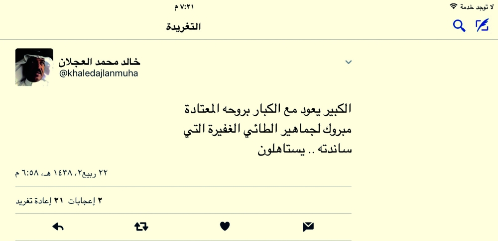 رئيس نادي الطائي السابق وعضو شرفه الحالي خالد العجلان قال عبر حسابه الشخصي في تويتر «الكبير يعود مع الكبار بروحه المعتادة مبروك لجماهير الطائي الغفيرة التي ساندته يستاهلون». فيما طالب الناقد الرياضي فرحان الجار الله أمير حائل ورجال الأعمال بالوقوف مع الطائي بحكم أنه الواجهة المشرفة للمنطقة ووجوده بدوري جميل رافد اقتصادي مهم لمنطقة حائل وذكر الجار الله أن الطائي يئن حاليا في دوري الدرجة الأولى وفي قاع الترتيب والمطلوب هو إنقاذه لأنه كبير.