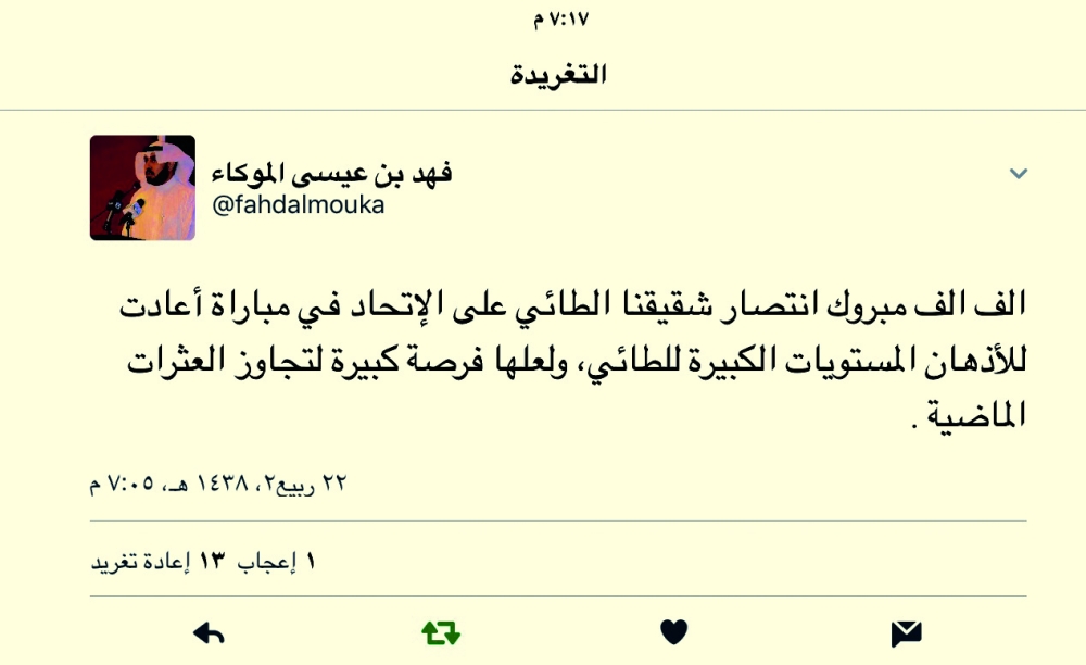 عم الفرح يوم أمس الأول مدينة حائل بعد الفوز الكبير الذي حققه الفريق الأول لكرة القدم بنادي الطائي (درجة أولى) على فريق الاتحاد 2/1 في المباراة التي أقيمت على مدينة الأمير عبدالعزيز بن مساعد الرياضية في حائل ضمن مباريات كأس الملك دور الـ32، وبذلك التأهل لدور الـ16، إذ عادت الروح بهذا الفوز لرياضة حائل التي ركنت إلى الظل قبل أكثر من 10 سنوات عقب هبوط الطائي الذي كان يطلق عليه (صائد الكبار) وبعد الفوز كان رئيس نادي الجبلين السابق فهد بن عيسي الموكاء أول المباركين لشقيقهم نادي الطائي في بادرة غير مستغربة منه، إذ قال عبر حسابه في تويتر «ألف مبروك فوز شقيقنا على الاتحاد في مباراة أعادت للأذهان المستويات الكبيرة للطائي ولعلها فرصة كبيرة لتجاوز العثرات الماضية».