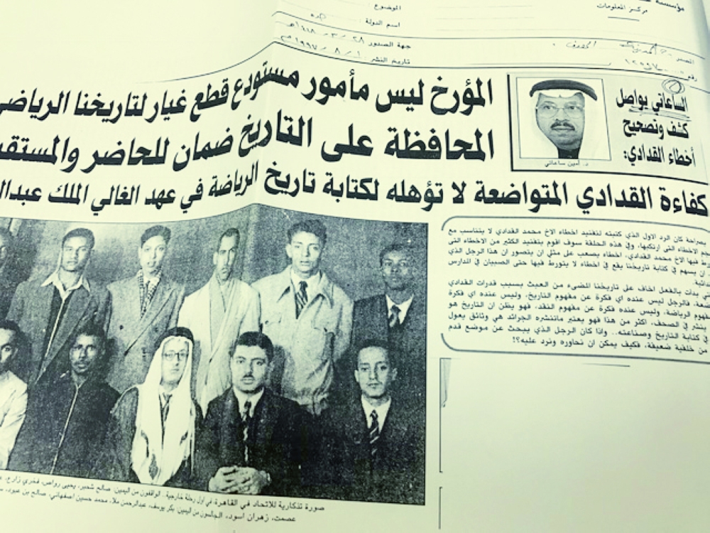 أما الدكتور أمين الساعاتي فلا يرى في كفاءة محمد القدادي المتواضعة قدرة تؤهله إلى كتابة التاريخ الرياضي، مؤكدا أن القدادي لا يمتلك وثائق تاريخية وإنما قصاصات جرائد وبالتالي توثيقه لتاريخ الرياضة هو كلام «جرائد».