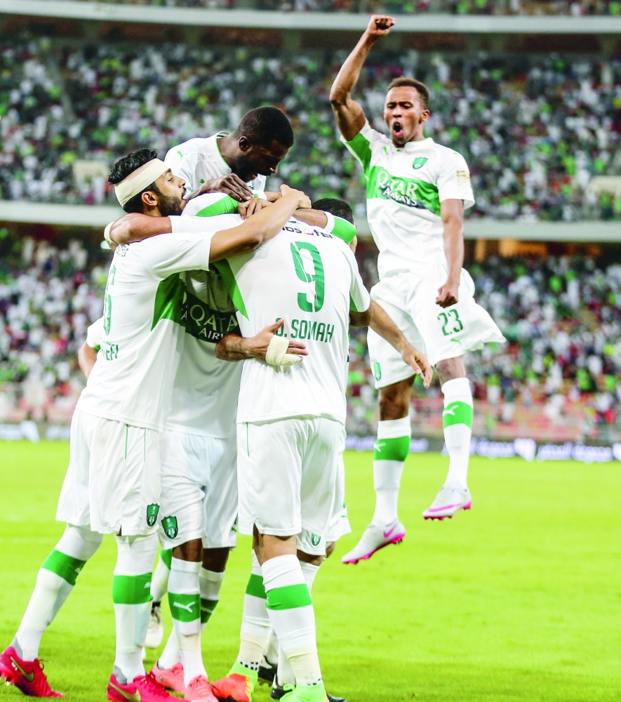 لاعبو الأهلي يحتفلون بأحد أهدافهم في الشباب. (تصوير: عبدالغني بشير)