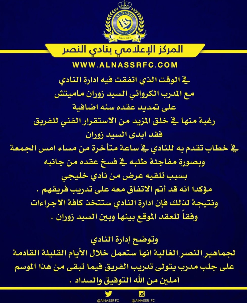أصدرت إدارة نادي النصر اليوم (السبت) بياناً أكدت فيه أن مدرب الفريق الكرواتي زوران ماميتش قدم في ساعة متأخرة من مساء أمس الجمعة استقالته من تدريب الفريق، رغم أنه كان قد وقع على تمديد عقده مع النادي لمدة عام آخر.