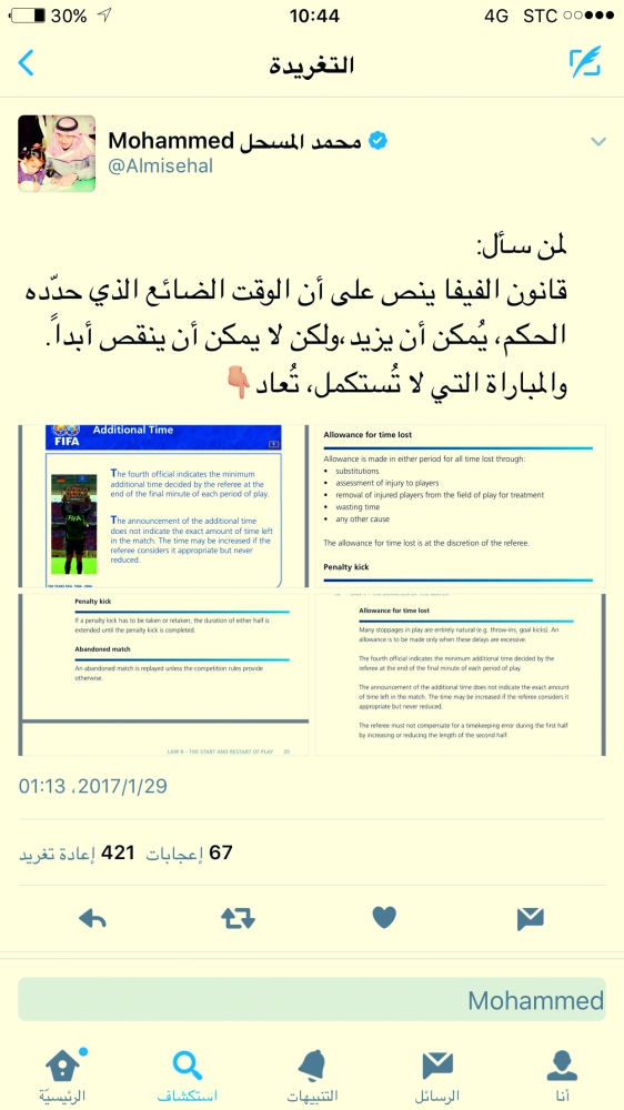 أشعل أمين عام اللجنة الأوليمبية السعودية عضو المكتب التنفيذي للمجلس الأوليمبي الآسيوي رئيس إدارة المنتخبات السعودية السابق محمد المسحل الوسط الرياضي بعد أن كشف ضرورة إعادة مباراة الهلال والاتفاق التي لُعبت أمس الأول وفاز فيها الهلال بهدف مقابل لا شيء، منفرداً بصدارة الترتيب بـ40 نقطة؛ وذلك بحسب قوانين الفيفا التي تُلزم إعادة المباراة، لأن الحكم الألماني أطلق صافرته قبل نهاية الوقت، مؤكدا أحقية نادي الاتفاق بطلب إعادة المباراة، إذ إن الحكم أعلن نهاية المبارة في الدقيقة 93، بينما الوقت الإضافي كان مُقدراً بـ4 دقائق حسب ما رفع به الحكم الرابع بناء على إشارة حكم الساحة الألماني فيرديريك فيلكس. وقال المسحل أمس (الأحد): «قانون الفيفا ينص على أن الوقت الضائع الذي حدّده الحكم، يُمكن أن يزيد، ولكن لا يمكن أن ينقص أبداً، والمباراة التي لا تُستكمل تُعاد»، مُرفقاً في تغريدته نص قرار الفيفا المُلزم بإعادة المباراة، وهي التغريدة التي وجدت ردود أفعال كثيرة، ومن المتوقع أن تُعيد الجدل للوسط الرياضي، كونها نتيجة ستؤثر كثيراً في السباق على لقب الدوري هذا العام.