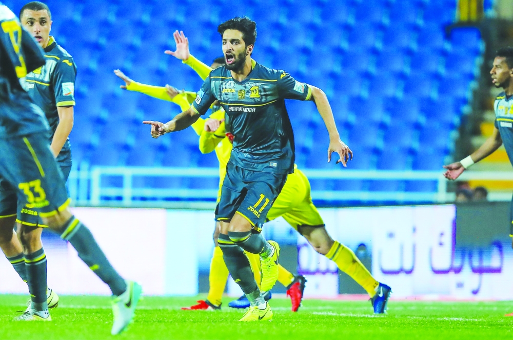 لاعب الاتحاد فهد الأنصاري ينطلق فرحا بعد تسجيله الهدف الأول في مرمى التعاون أمس في بريدة. (واس)