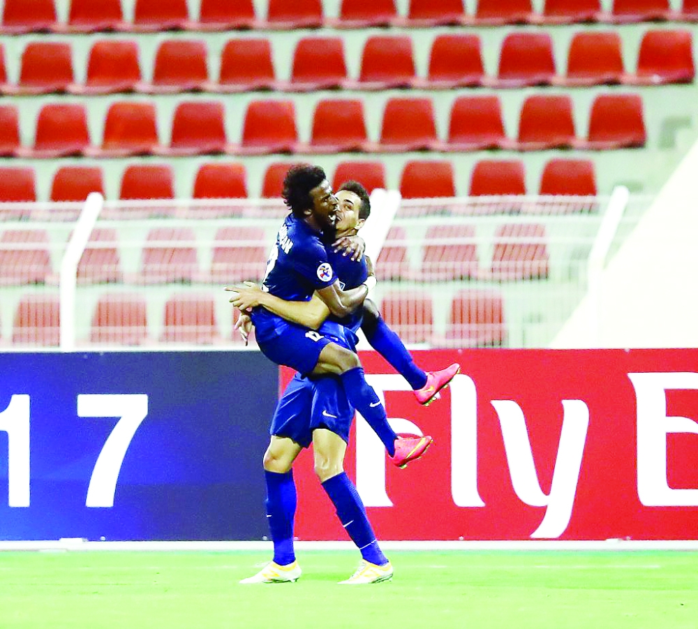 ياسر الشهراني يهنئ زميله إدواردو. (المركز الإعلامي بنادي الهلال)