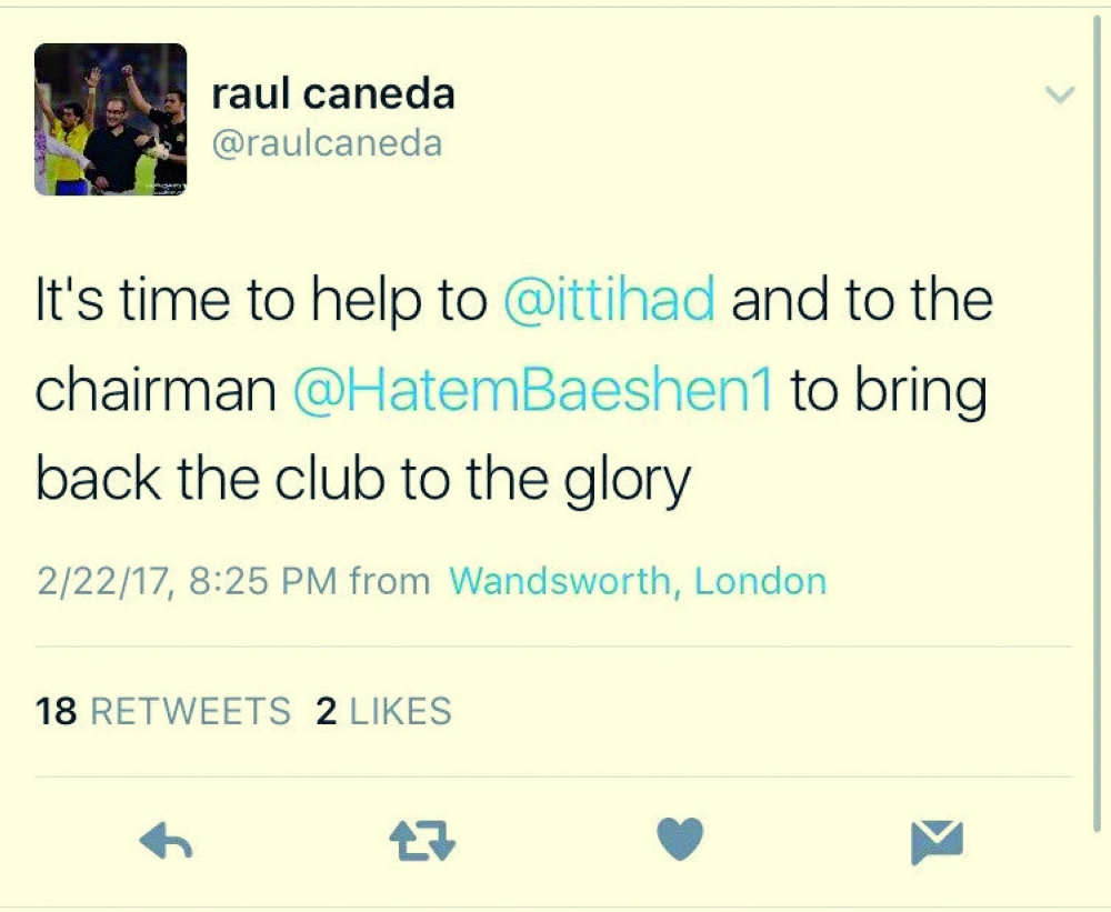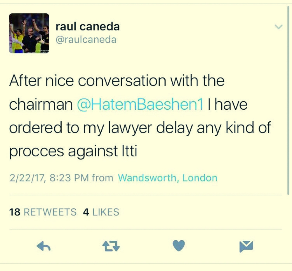 أوضح المدرب الإسباني راؤول كانيدا عبر حسابه الشخصي في (تويتر) اليوم (الأربعاء) أنه طلب من محاميه تأخير المطالبة المالية على نادي الاتحاد، بعد محادثة لطيفة مع رئيس النادي الحالي المهندس حاتم باعشن، وقال في تغريدته: «حان الوقت لمساعدة الاتحاد لجلب المجد مرة أخرى للنادي».
