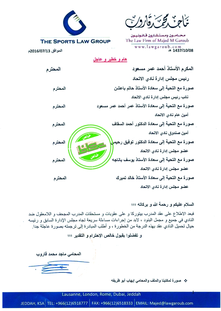 كشفت وثائق حصلت عليها «عكاظ» في شأن قضايا نادي الاتحاد الخارجية، طلب المحامي القانوني الدكتور ماجد قاروب وفق خطاب مرسل إلى رئيس نادي الاتحاد أحمد مسعود «رحمه الله» بتاريخ 25 شوال 1437 باتخاذ إجراءات مساءلة سريعة تجاه مجلس إدارة نادي الاتحاد السابق ورئيسه حيال تحميل النادي عقد المدرب بيتوركا وما تضمنه من عقوبات ومستحقات مجحفة ولا معقولة ضد النادي في مجمل البنود وبهذه الدرجة من الخطورة، ما دفع برئيس الاتحاد الراحل أحمد مسعود إلى رفع خطاب إلى رئيس الهيئة العامة للرياضة الأمير عبدالله بن مساعد يطلعه فيه على كافة تفاصيل قضية المدرب الروماني. وتضمن ذلك الخطاب ما يلي: «تبين لإدارة النادي فور تسلمها مشكلات وقضايا كبيرة وخطيرة ومريبة حيال تعاقدات وتسويات تمت مع المدرب السابق للنادي بيتوركا والجهاز الفني وبعض اللاعبين يظهر فيها كثير من التهاون والتفريط في حقوق النادي».