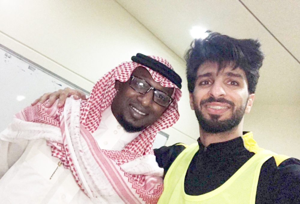 الأنصاري مع المولد في مقر نادي الاتحاد أمس. (عكاظ)