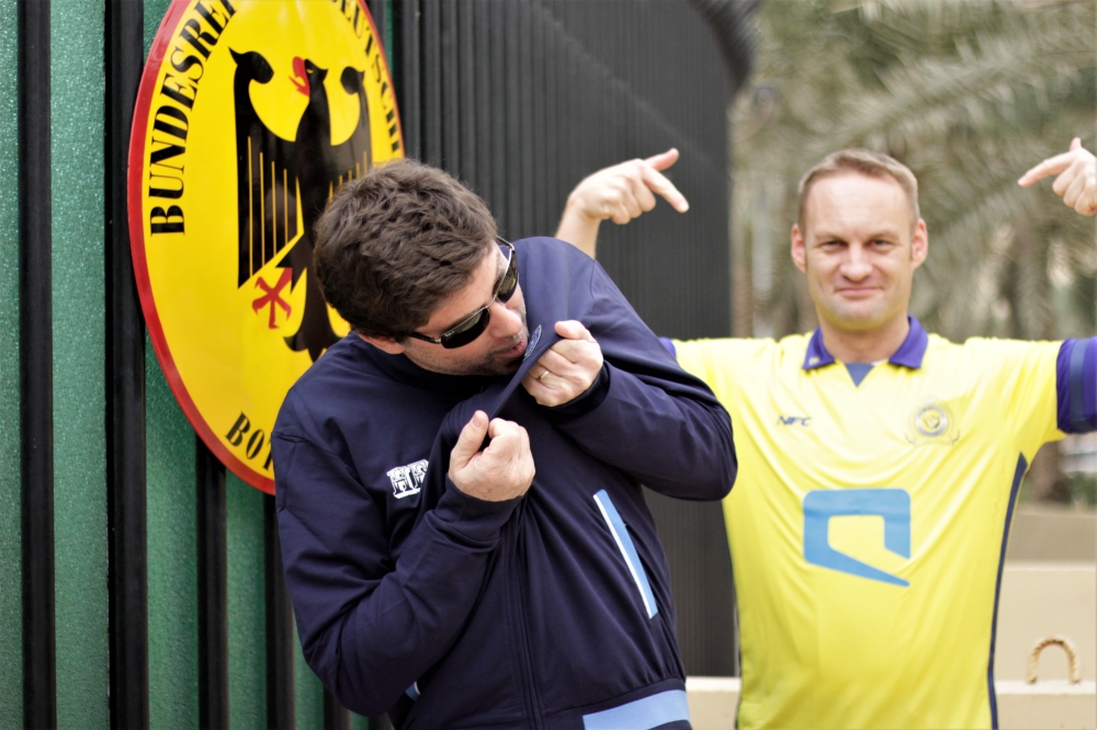وأضاف القسم الإعلامي: «عندما لاحظ فريق الإعلام قميصي الفريقين في يوم اللباس غير الرسمي في السفارة، وكما نعلم جميعا، هذان الفريقان من كبارالفرق السعودية وخصوصا في الرياض، قرر القسم أخذ بعض الصور لمشاركة الأصدقاء على حسابنا في تويتر. وتفاجأنا هنا أن كل من وولفغانغ ونيكولاي، يتابعان مستجدات الفرق في الدوري ويعلمان بترتيب فريقيهما، ولم يدخرا جهدا في إظهار روح المنافسة الودية أمام الكاميرا».