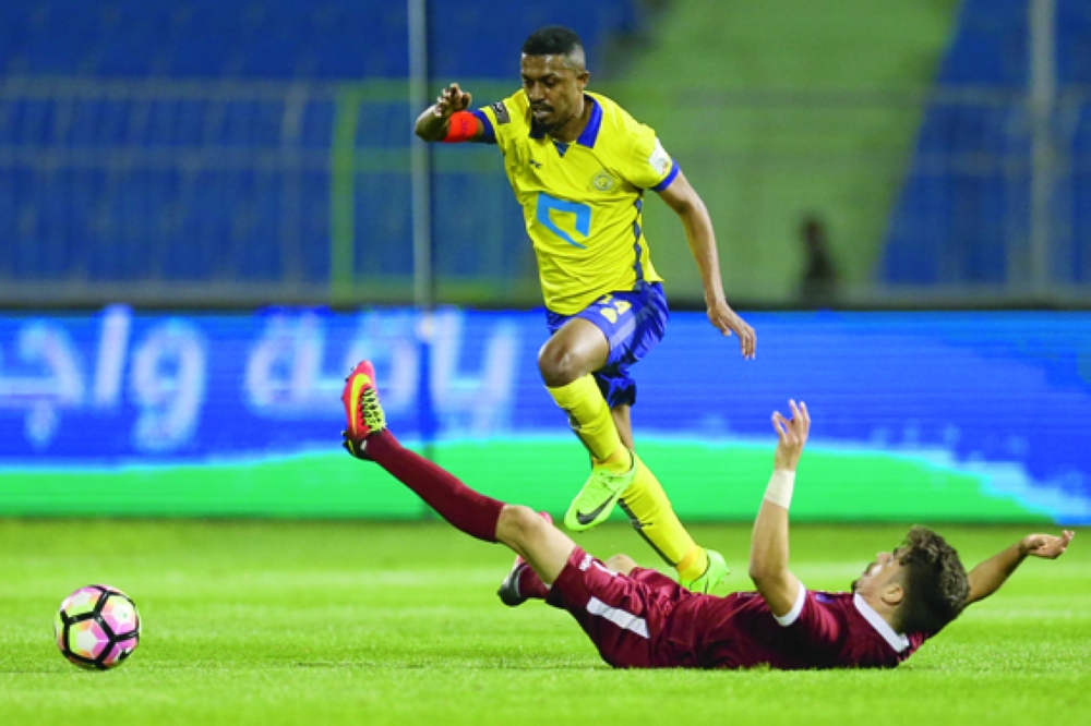 لاعب النصر إبراهيم غالب يتجاوز لاعب الفيصلي. (تصوير: عبدالعزيز السلامة)