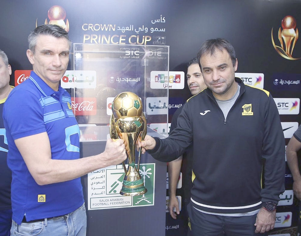 المدربان بعد المؤتمر الصحفي الذي جمعهما أمس في الرياض.