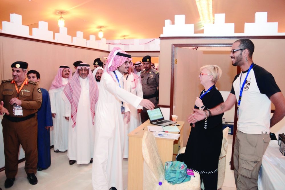 الفيصل يصافح منسوبي الاتحاد السعودي للسيارات.