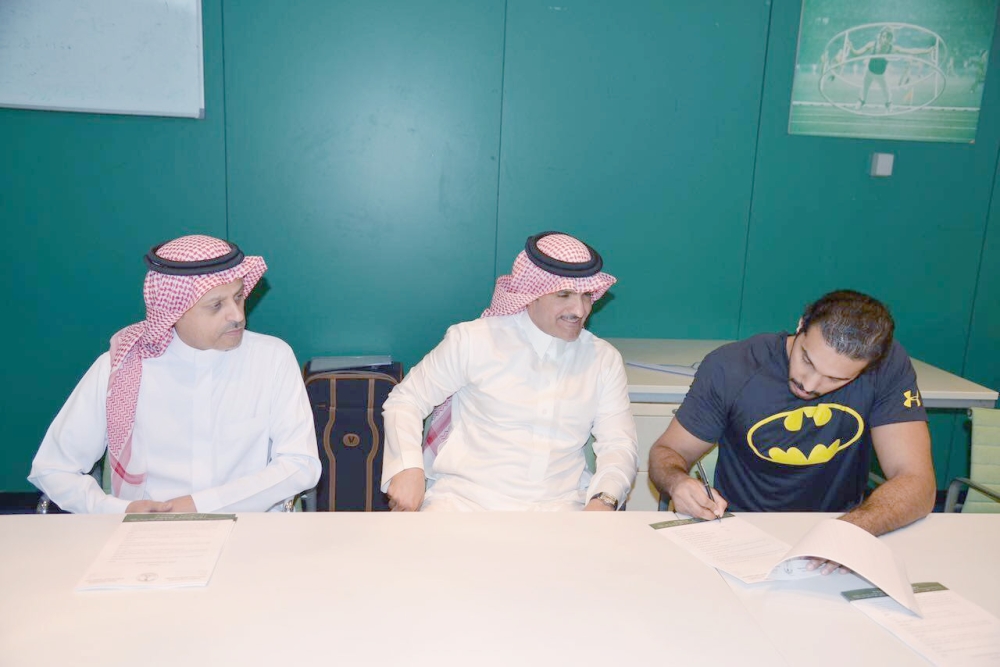 رئيس الاتحاد السعودي لكرة الماء ناصر الدغيثر خلال توقيعه عقدا مع أحد اللاعبين.
