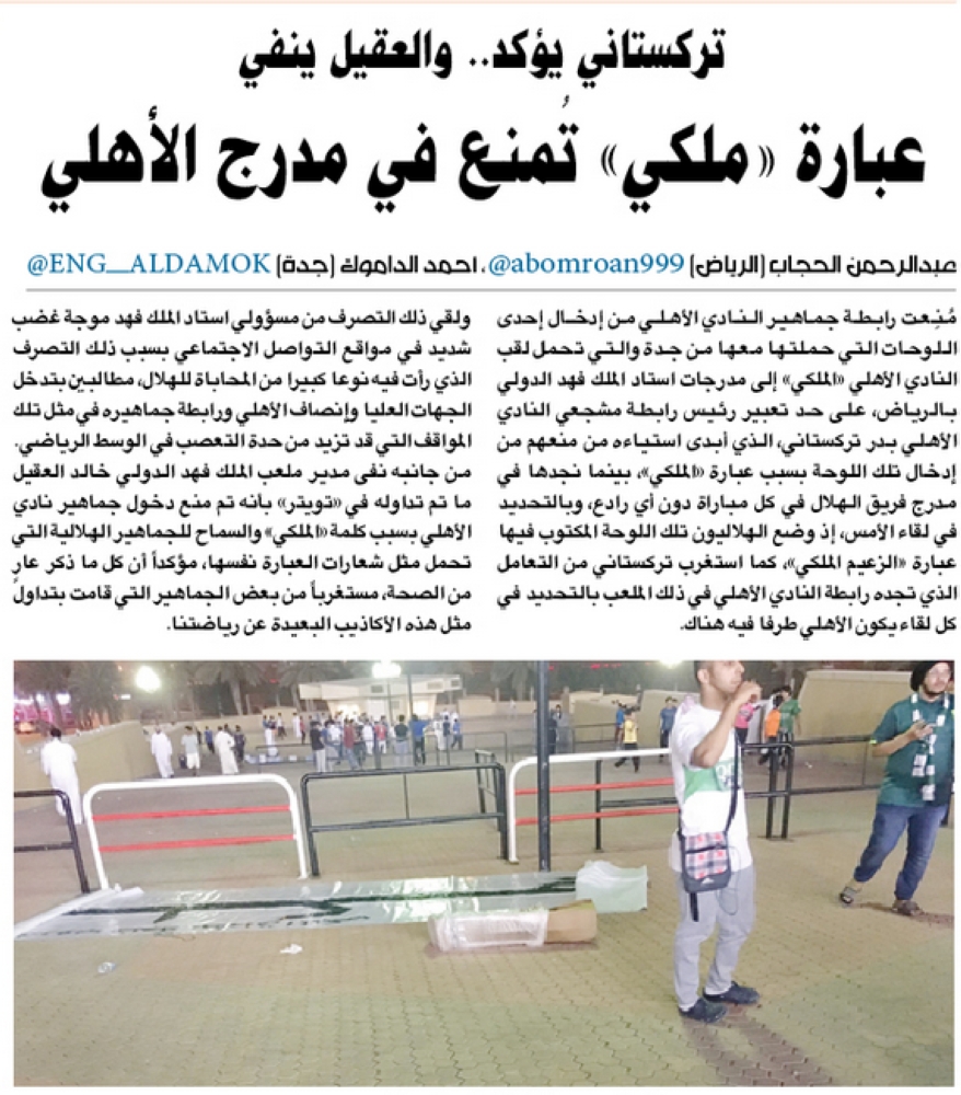 وكان رئيس رابطة النادي الأهلي بدر تركستاني، أبدى تذمره من إدارة الملعب، بسبب منعهم من إدخال لافته مكتوب عليها «الملكي»، ومنع بعض الجماهير لمجرد ارتداء قمصان مكتوب عليها «الأهلي الملكي الأصلي»، والسماح للهلال بإدخالها.