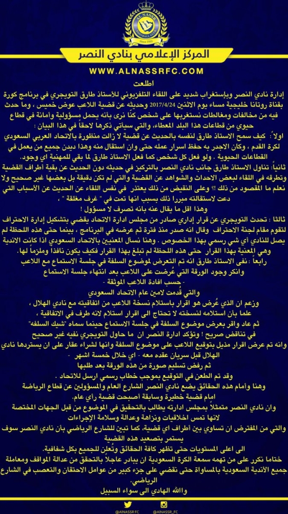 استغربت إدارة نادي النصر خروج طارق التويجري رئيس دائرة الاحتراف (المستقيل)، فضائيا بالتعليق على قضية اللاعب عوض خميس وما حدث فيها من مخالفات ومغالطات، وهي ما زالت منظورة، وأن نادي النصر بعد ظهور هذه الحقائق التي جاءت على لسان «التويجري»، يضع الشارع العام والمسؤولين على قطاع الرياضة أمام قضية خطيرة وسابقة أصبحت قضية رأي عام، جاء ذلك خلال البيان الذي أصدرته إدارة نادي النصر، وحصلت «عكاظ» على نسخة منه هذا نصه: