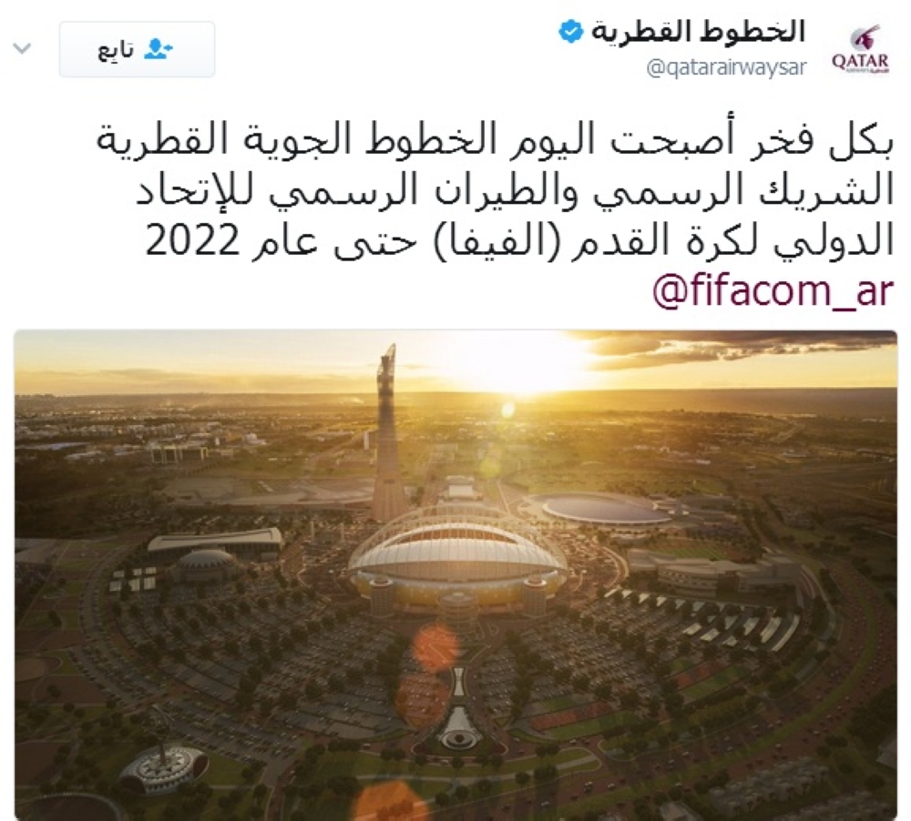 أعلنت الخطوط الجوية القطرية اليوم (الأحد) ارتباطها بعقد رعاية وشراكة كبير، مع الاتحاد الدولي لكرة القدم (الفيفا) حتى نهائيات كأس العالم التي تستضيفها قطر عام 2022. وقالت الشركة في بيان إنها ستكون الراعي والشريك الرسمي للفيفا خلال نهائيات كأس العالم المقبلة بروسيا في 2018 وحتى النهائيات العالمية التالية في 2022 في قطر.
