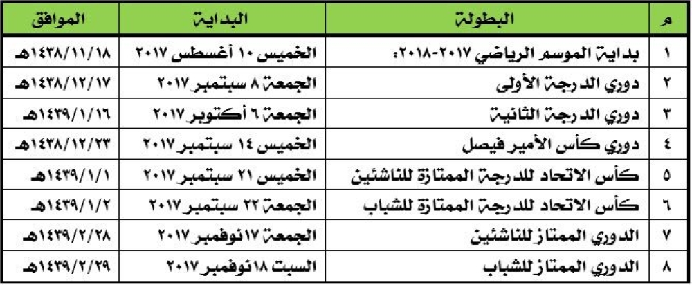 بداية الموسم الرياضي 2017 - 2018 الخميس 10إغسطس 2017 الموافق 18/111438هـ