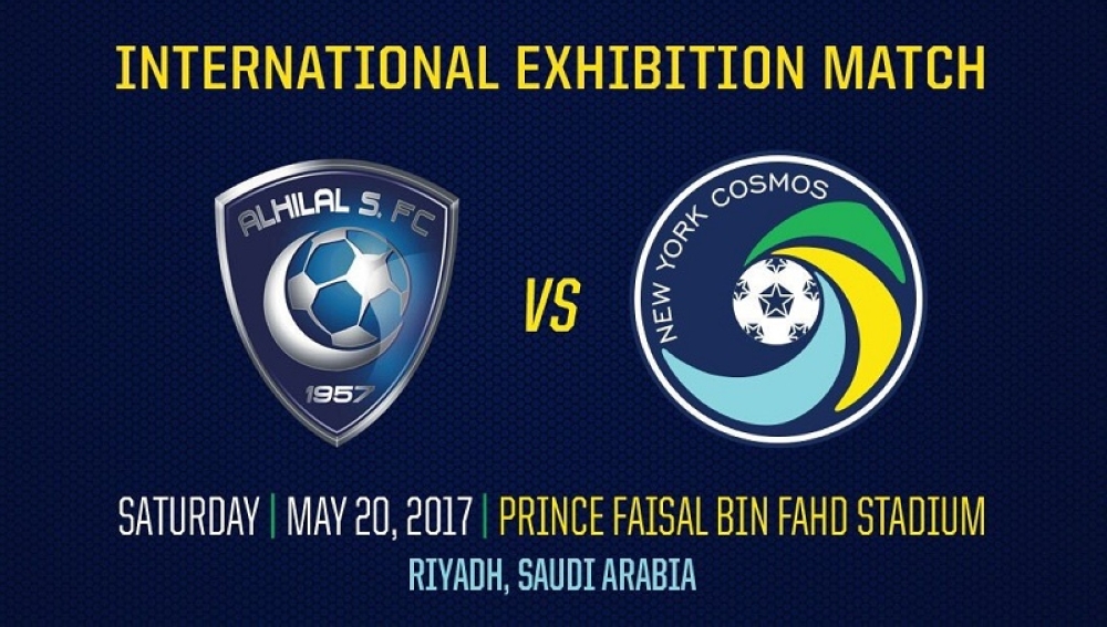 يلتقي الفريق الأول لكرة القدم بنادي الهلال، بنظيره نيويورك كوزموس الأمريكي، غدا، على استاد الأمير فيصل بن فهد بالرياض، في مباراة استعراضية ضمن فعاليات الهيئة العامة للترفيه، كما تصاحب المباراة عروض مظلية.