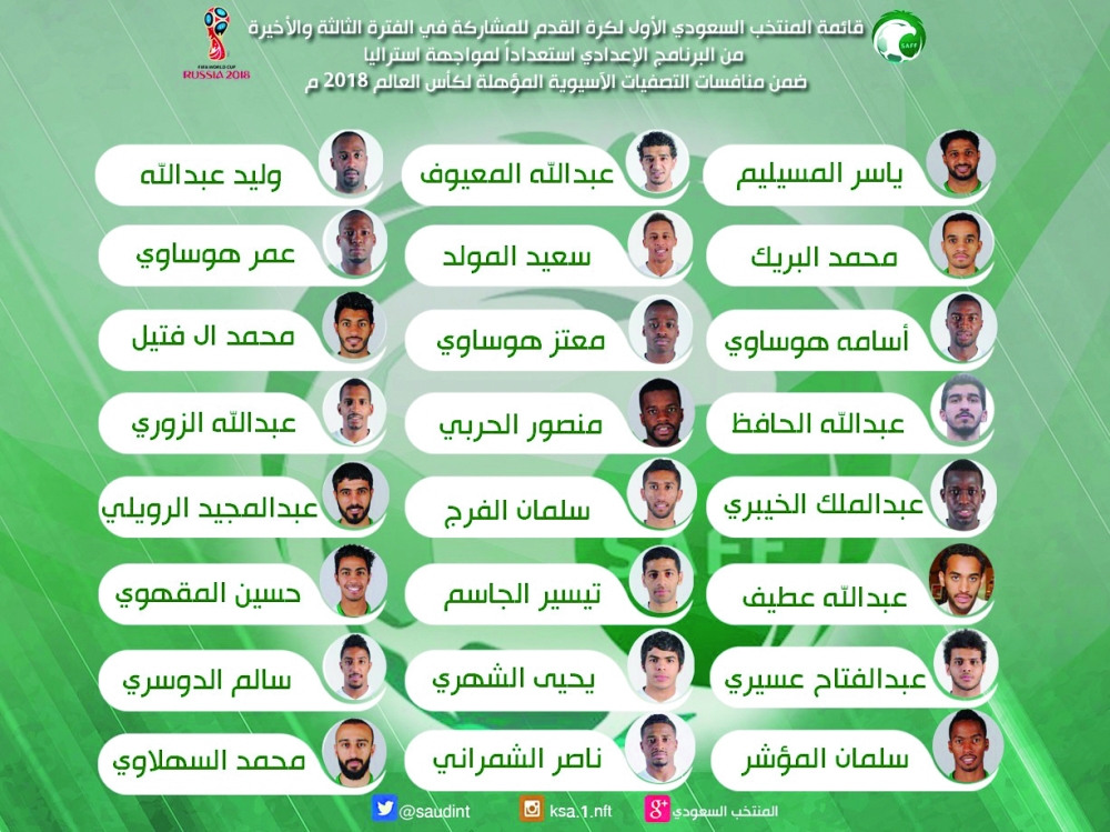 استقر المدير الفني للمنتخب الوطني الأول لكرة القدم، الهولندي بيرت فان مارفيك، على 24 لاعبا سيمثلون أهم أوراقه في مواجهة منتخب أستراليا في الثامن من شهر يونيو، ضمن مباريات الجولة الثامنة من التصفيات الآسيوية المؤهلة إلى كأس العالم 2018.