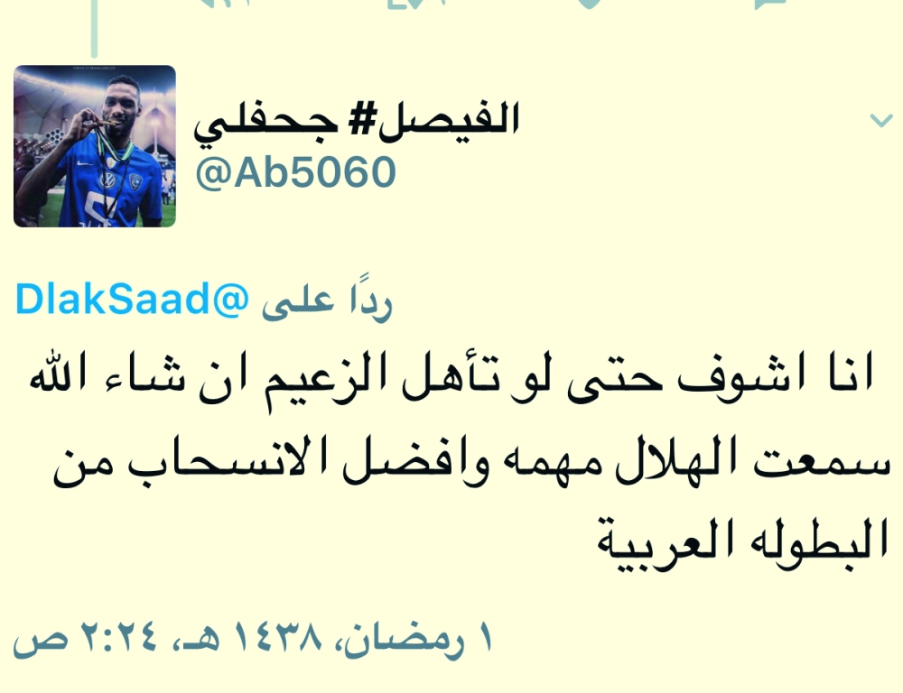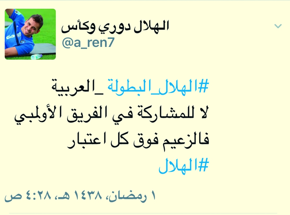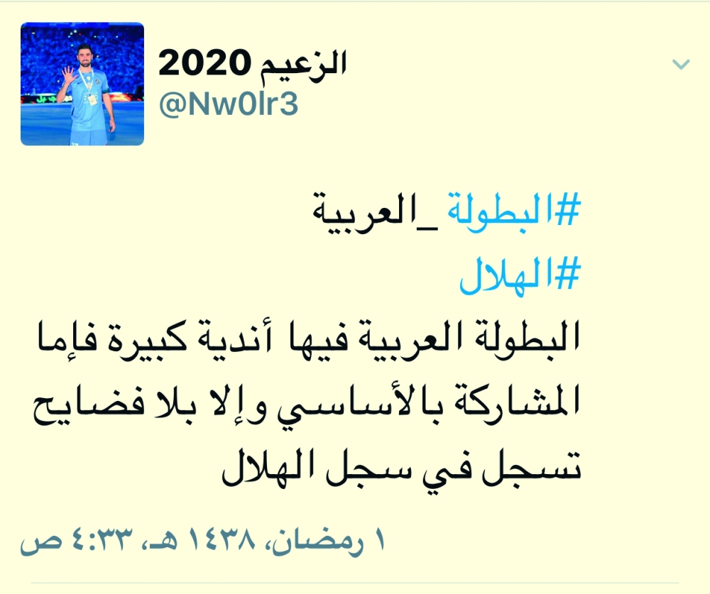 أثارت تسريبات عن نية إدارة نادي الهلال برئاسة الأمير نواف بن سعد المشاركة في البطولة العربية للأندية التي ستقام بالقاهرة في الفترة من 22 يوليو إلى 6 أغسطس القادمين بالفريق الأوليمبي، لتجنيب اللاعبين الإرهاق، لتوالي مشاركاته محليا وآسيويا، بجانب مشاركة 10 دوليين مع المنتخب الأول الذي يستعد للجولات الحاسمة في طريق تأهله لمونديال 2018، أثارت مخاوف الكثير من جماهير النادي التي رأت بأن المشاركة بالفريق الأوليمبي من شأنها أن تضعف الحضور الأزرق في هذه البطولة التي يشارك فيها نخبة من الأندية العربية الكبيرة، وأبدت تلك الجماهير عبر وسائل التواصل الاجتماعي تذمرها من هذا التوجه إن حدث؛ خوفاً من نتائج ثقيلة يتلقاها الفريق، مؤكدين أن سمعة الفريق فوق كل اعتبار، وأن الانسحاب من البطولة أفضل في هذه الحالة.