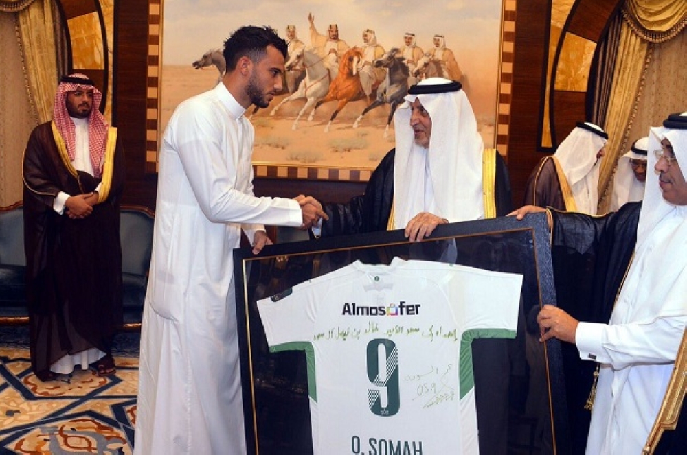تلقى مستشار خادم الحرمين الشريفين أمير منطقة مكة المكرمة الأمير خالد الفيصل لوحة تذكارية من لاعب النادي الأهلي المحترف السوري عمر السومة.