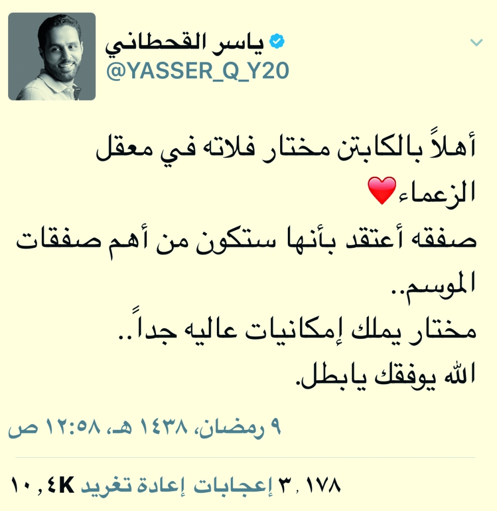 رحب قائد الفريق الهلالي ياسر القحطاني باللاعب المنضم حديثا للكتيبة الزرقاء لاعب الوحدة السابق مختار فلاتة، عبر حسابه الخاص بـ«تويتر» قائلا: ‏«أهلا بالكابتن مختار فلاتة في معقل الزعماء، ‏صفقة أعتقد بأنها ستكون من أهم صفقات الموسم، ‏مختار يملك إمكانات عالية جدا،‏ الله يوفقك يا بطل». جماهير هلالية علقت بقولها: «بلا شك عندما يأتي الترحيب باللاعب مختار فلاتة من القائد الهلالي صاحب الخبرة والإنجازات المتكررة سينعكس ذلك إيجابيا على اللاعب، وسيعطيه الروح والحماس لتقديم كل ما يملكه من إمكانات تصب لصالح فريقه الجديد الهلال».