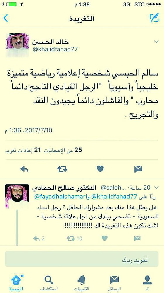 «عكاظ» اتصلت على خالد الحسين إلا أنه رفض التعليق على التغريدة أو الرد على التغريدات التي ظهرت في تويتر.