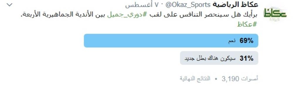 وكانت تلك الاستفتاءات من خلال الحساب الرسمي لصحيفة «عكاظ» عبر موقع التواصل الاجتماعي تويتر، الذي كان سؤال الاستفتاء على النحو التالي: برأيك هل سينحصر التنافس على لقب دوري جميل بين الأندية الجماهيرية الأربعة؟