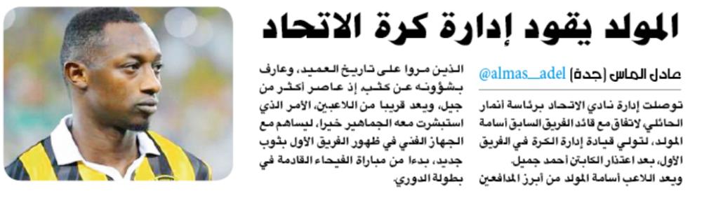 وذلك عندما أصدرت إدارة الاتحاد أمس السبت بياناً رسمياً مقتضب بث عبر الحساب الرسمي في موقع التواصل الاجتماعي (تويتر) جاء نصه كالتالي: صدر قرار مجلس إدارة النادي برئاسة الاستاذ أنمار بن عبدالله الحائلي بتعيين الكابتن أسامة المولد مديراً للفريق الكروي الأول، وتمنى له مجلس الإدارة التوفيق في مهمته بالتعاون مع جميع أعضاء الفريق.