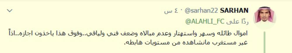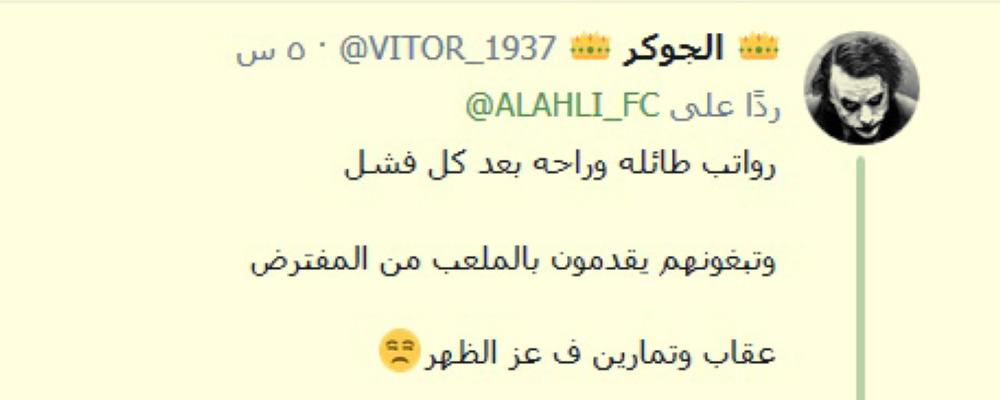وظهرت ردود فعل الجماهير الأهلاوية قوية وغاضبة من الراحة الممنوحة للاعبين عن مران يوم أمس، إذ قالوا: لا نعلم ما الفائدة من هذه الراحة الممنوحة للاعبين الذين لا يستحقونها بتاتاً، هل قدموا مستوى مميزا؟ هل حققوا الفوز؟ هل قدرونا كجماهير؟ كل إجابات الأسئلة الثلاثة الماضية (لا.. لا.. لا).