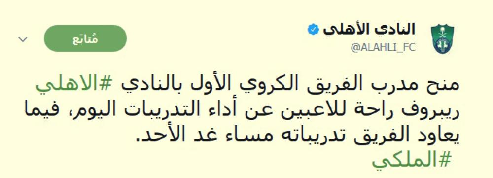وذلك عقب أن بث حساب النادي الأهلي الرسمي في موقع التواصل الاجتماعي (تويتر) تغريدة جاء نصها: منح مدرب الفريق الكروي الأول بالنادي الأهلي ريبروف راحة للاعبين عن أداء التدريبات اليوم، فيما يعاود الفريق تدريباته مساء غد الأحد.