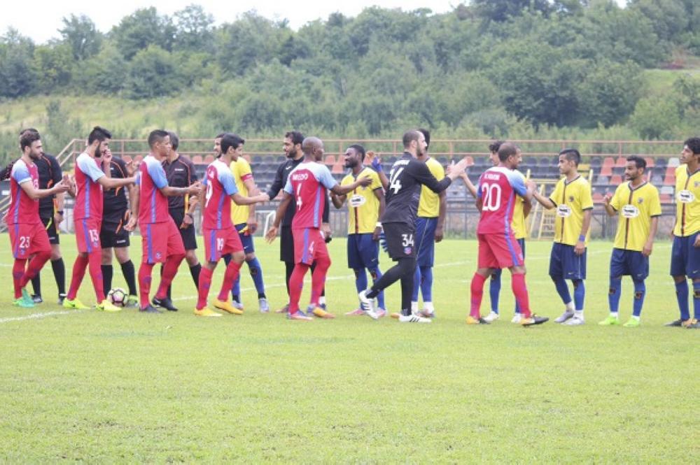لاعبو الحزم والكويت الكويتي قبل انطلاقة المباراة الودية بينهما.